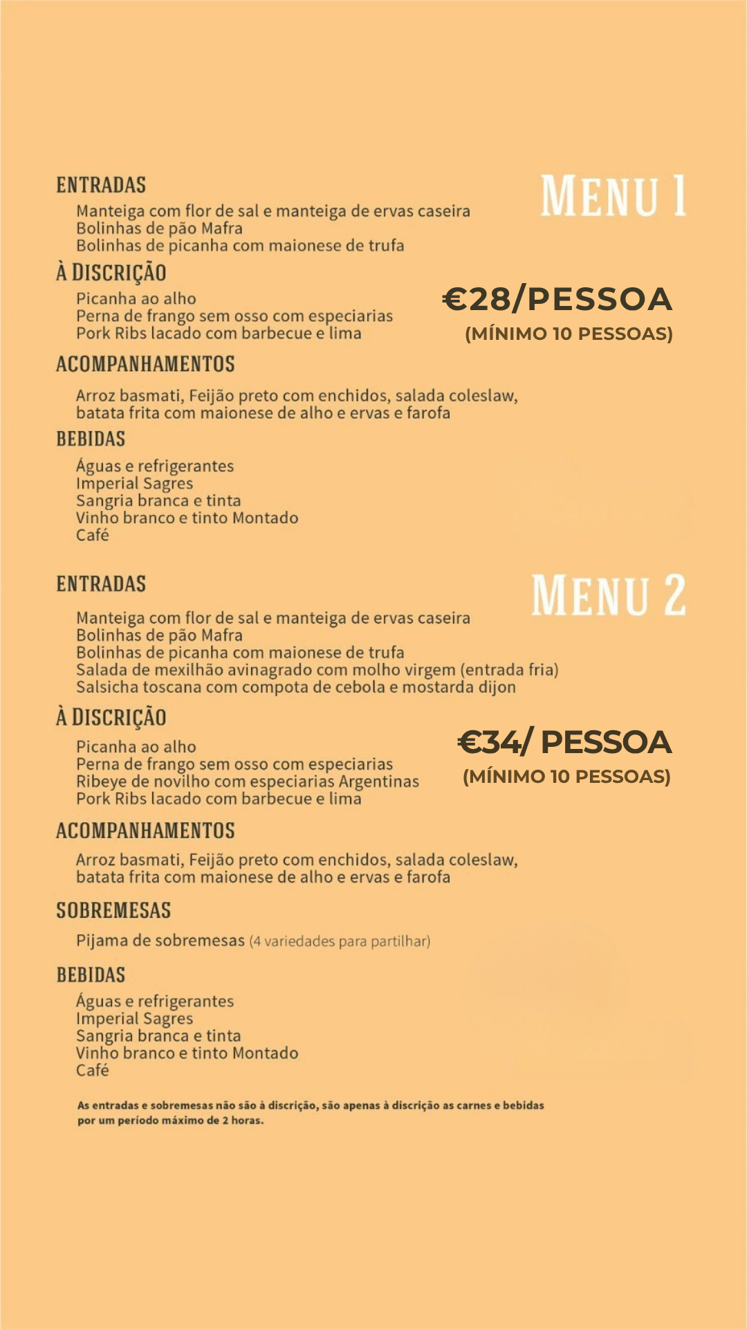 Na nossa ementa encontre pratos irresistíveis, como a picanha ao alho servida à discrição, parrilhada mista, entrecôte de novilho e costeletas de borrego . Para os apreciadores de peixe, sugerimos especialidades como o bacalhau lascado com broa e o polvo confitado à lagareiro . E, para terminar, nada melhor do que as nossas sobremesas caseiras , incluindo cheesecake e bolo de chocolate . Também dispomos de opções vegetarianas para satisfazer todos os gostos.